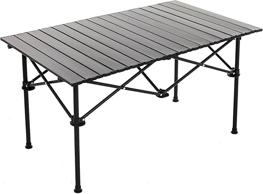- The portable camping table weighs only approx. 3 kg. The aluminium table top and folding feet are easy to fold. Both the top and stand of the folding roll-up table can be assembled in seconds, and take up little storage space, which can be easily stored in the included drawstring bag